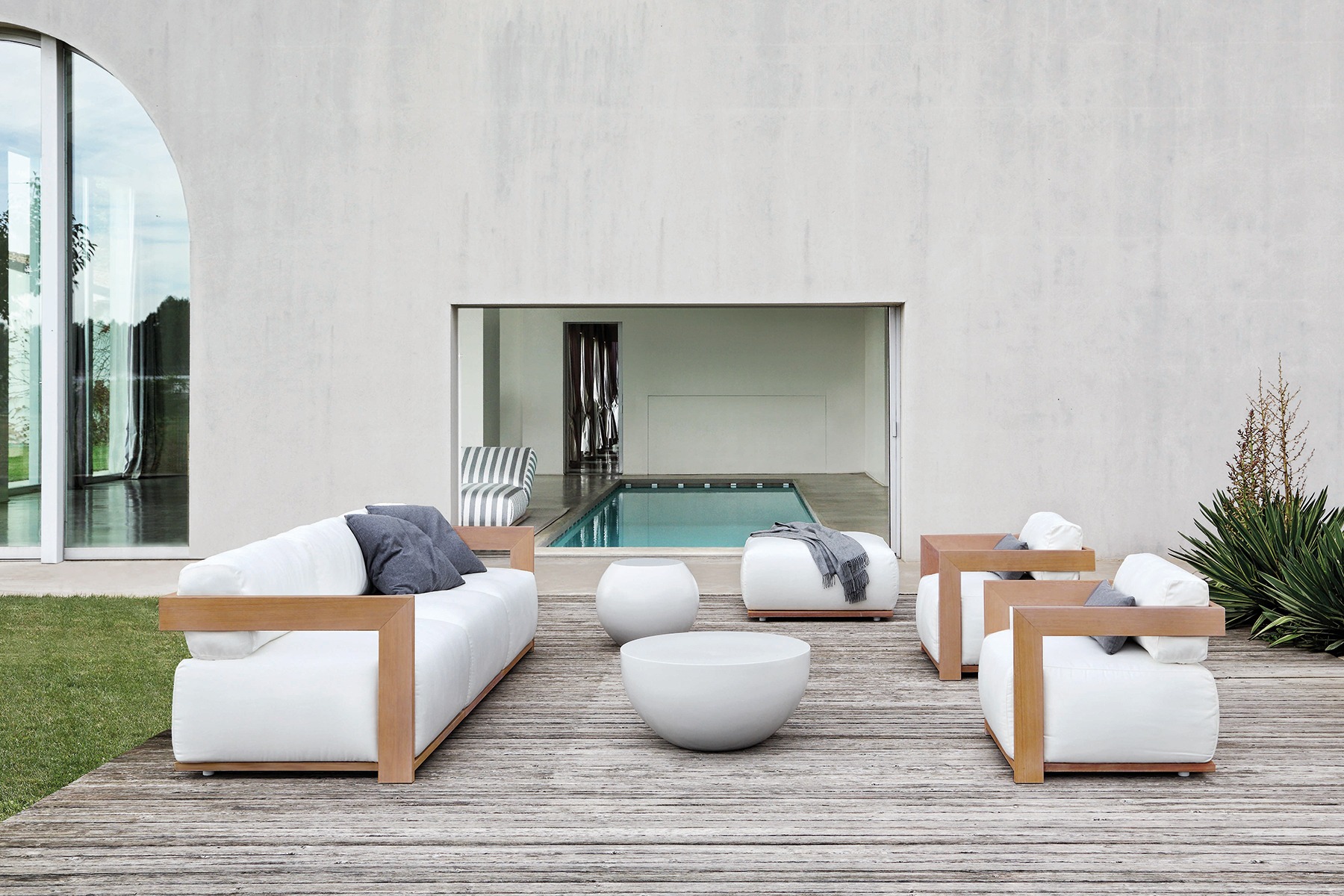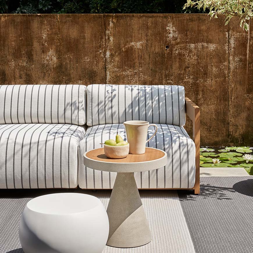 Canapé modulable, fauteuil et lounge bed – disponible en version simple et double: la collection Claud Open Air se distingue par son design minimaliste et ses coussins moelleux. À la fois chics et résistants, ces meubles sont réalisés en bois massif d’Iroko avec de la peinture de protection. Des matériaux précieux avec rembourrage moelleux pour profiter du salon et d’une oasis de tranquillité, pour vous détendre en plein air.